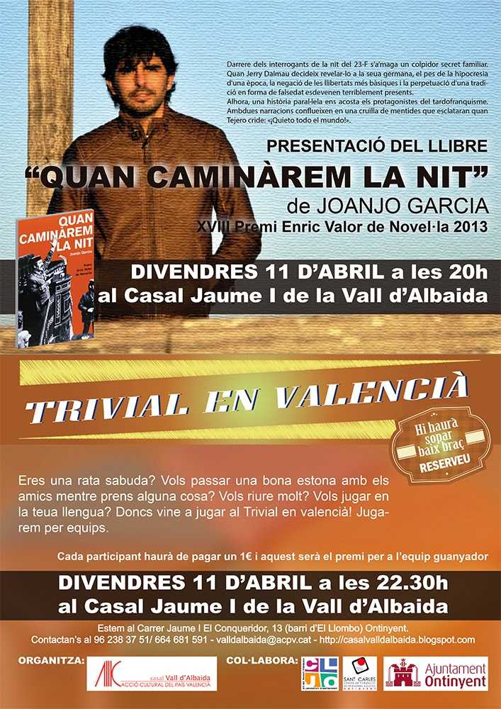 El dia 11 d’abril, a les 22:30h tindrà lloc aquest Trivial en valencià al Casal Jaume I de l Vall d’Albaida de la mà de Joanjo Garcia amb llarga tradició organitzant Trivials a València. També tindrem a Joanjo per la vesprada a les 20h presentant-nos el seu llibre “Quan caminàrem la nit” premi Enric Valor de novel·la. Per això també proposem un sopar baix braç al Casal, per al que necessitarem que ens aviseu prèviament.