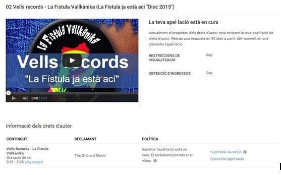 El grup de música La Fístula Vallkànika de Tavernes de la Valldigna està sofrint una injustícia a aquesta plataforma. Dies enrere, el cantant del grup va publicar uns vídeos amb les cançons del seu nou disc, amb la sorpresa de que instants després rebia una reclamació a tots els vídeos publicats. Aquesta reclamació deia que totes les cançons publicades eren propietat d’una companyia anomenada “The Orchard Music”. Lògicament, açò no és cert ja que el grup de música té registrades totes les cançons i per tant li pertanyen. Així que van decidir presentar una apel·lació que Youtube va desestimar dues voltes, donant-li la raó a la companyia. Després de veure la passivitat de Youtube, el grup Valldigna va decidir contactar a través de correu electrònic directament amb “The Orchard Music”, encara que també va tindre resultat negatiu ja que tampoc es va donar una solució al problema, Orchard afirma que són seus els drets de les cançons.