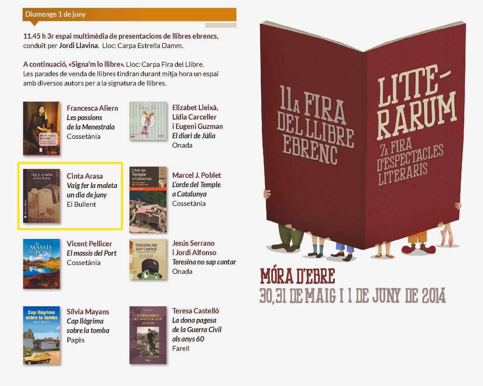 I allà estarà Vaig fer la maleta un dia de juny, de Cinta Arasa. El diumenge 1 de juny, a les 11.45h., la trobarem al 3r espai multimèdia de presentacions de llibres ebrencs, conduït per Jordi Llavina a la Carpa Estrella Damm.