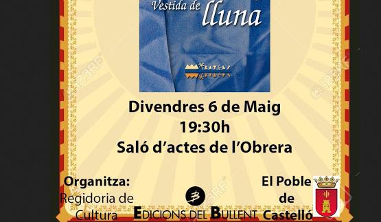 El divendres 6 de maig, Vestida de lluna, d’Elvira Cambrils es presentarà al poble que li va entregar el premi Soler i Estruch de narrativa. El poble del premi que l’ha dut a la publicació: Castelló de la Ribera. Serà a les 19:30 al Saló d’actes de l’Obrera (c/ Major de Castelló de la Ribera).