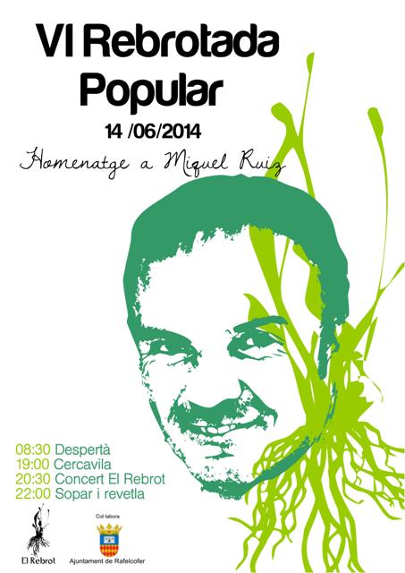 L’Associació Cultural El Rebrot ha organitzat per al proper dissabte 14 de juny a Rafelcofer, la VI REBROTADA POPULAR. Aquest any, com no podria ser d’altra manera,es dedicarà al mestre, company i amic Miquel Ruíz, que ens va deixar el juny de l’any passat. El programa d’actes serà el següent: