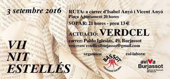 Un any més l’Associació Cultural el Bassot, amb la col·laboració d’AVIVA Burjassot, ha organitzat una nit màgica plena de poesia, música i gastronomia. La Nit, que va començar a organitzar-se fa set anys amb motiu de la crida de l’escriptor Josep Lozano, començarà amb una Ruta Literària conduïda per Isabel i Vicent Anyó, els néts del poeta de Burjassot, seguida del recital participatiu que donarà pas al tradicional sopar (cal fer reserva enviant un correu a estellesiburjassot@gmail.com). Per finalitzar la nit, hi haurà la música del grup alcoià Verdcel.