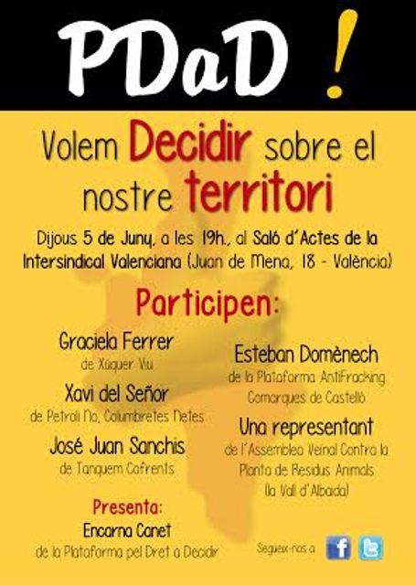 Dijous 5 de juny la Plataforma pel Dret a Decidir organitza una taula debat amb el títol “Volem decidir sobre el nostre territori”. L’acte comptarà amb la participació de representants de moviments per la defensa del territori i el medi ambient com: