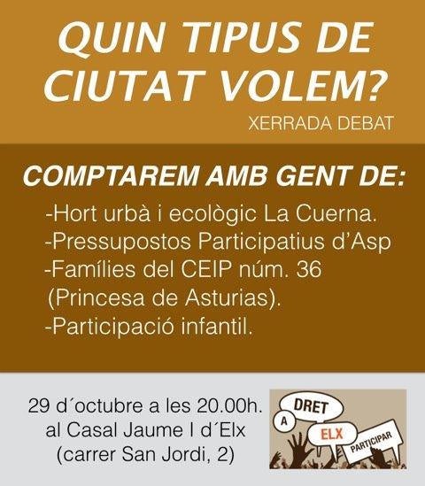 Xerrada-Debat: “Quin tipus de ciutat volem?” HORA: dimecres 29 DIA: 20:00 LLOC: Acpv-Casal Jaume I d’Elx Alaquàs