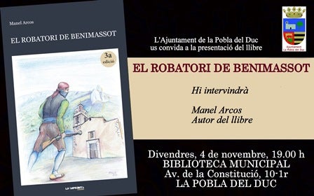 Aquest divendres, 4 de novembre de 2016 A les 19.00 h Xerrada sobre el meu llibre El robatori de Benimassot A la Biblioteca Municipal de la Pobla del Duc (Av. de la Constitució, 10-1r pis). Manel Arcos i Martínez