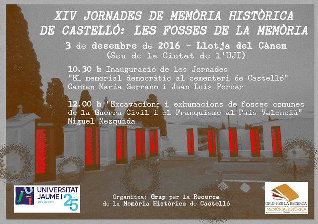 En primer lloc, a les 10.30h s’inauguraran les jornades amb “El memorial democràtic al cementeri de Castelló” de la mà de Carmen Maria Serrano i de Juan Lluis Porcar.
