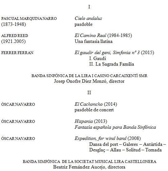Aquesta banda ha obtingut enguany el primer premi i menció d’honor en el XXXIX Certamen Provincial de Bandes de Música de València. En la segona part intervindrà la Banda Simfònica de la Societat Musical Lira Castellonera, dirigida per Beatriz Fernández Aucejo.