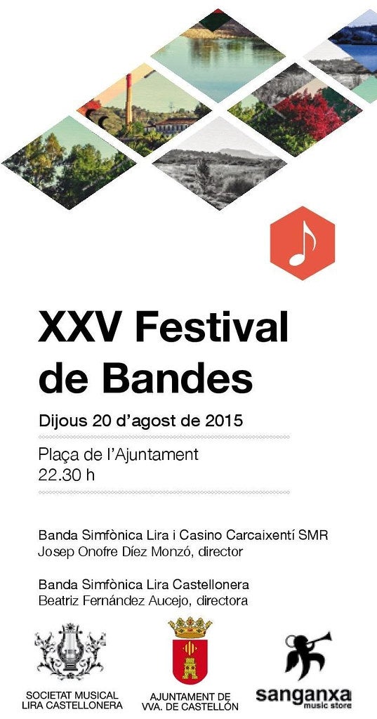 El pròxim dijous 20 d’agost, a partir de les 22:30, començarà el XXV Festival de Bandes de Castelló de la Ribera, organitzat i patrocinat per l’Ajuntament de la vila i per la Societat Musical Lira Castellonera. A la plaça de l’Ajuntament, i en el context de les Festes Majors de 2015, actuarà, en primer lloc, la Banda Sinfónica de la Lira i Casino Carcaixentí, dirigida per Josep Onofre Díez Monzó.