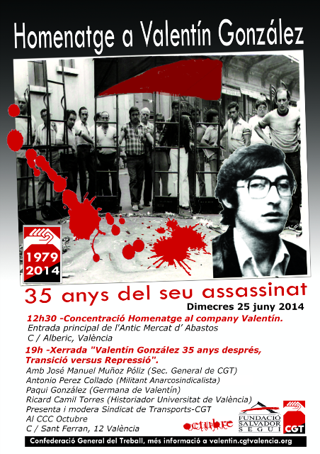 El proper 25 de juny es compleixen 35 anys de la mort Valentín González Ramírez, treballador de la Colla del Mercat de dAbastos de València, militant anarcosindicalista de 20 anys d’edat. Va ser assassinat el 25-6-79 d’un tret a boca de canó per la Policia Nacional a la Vaga legalment autoritzada en defensa de les reivindicacions de la classe treballadora.