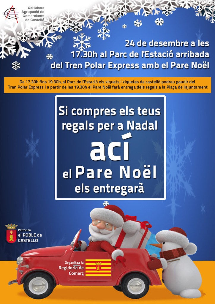 De 17.30h fins 19.30h, al Parc de l’Estació els xiquets i xiquetes de castelló podreu gaudir del Tren Polar Express i a partir de les 19.30h el Pare Noël i els seus ajudants “Els Elfos” faran entrega dels regals a la Plaça de l’ajuntament