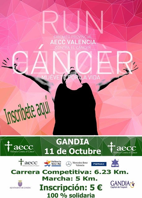 El circuit que esta composat per 11 proves en ciutats distintes de la província tindrà parada a la nostra ciutat com a RUNCANCER GANDIA i se celebrarà el diumenge 11 d’octubre, prop del 18 d’octubre Dia Mundial del Càncer. El cost de l’inscripció és de 5 euros però hi ha que saber que el 100% de la recaptació és per a l’Associació amb el que es finançarà un projecte d’investigació en càncer de colon.