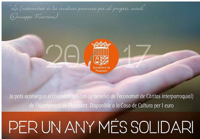 Per tercer any consecutiu, l’Ajuntament de Picassent ha editat un calendari solidari per tal de recaptar fons per a Càritas Interparroquial Picassent. Una iniciativa que s’emmarca dins de les ajudes i subvencions que l’Ajuntament destina a Càritas, i que a l’igual que en anys anteriors, està tenint una gran acollida. En pocs dies, més de 600 persones ja el tenen a les seues cases. Aquelles que encara no el tinguen i vulguen adquirir-lo, poden fer-ho al preu d’1 euro a la Casa de Cultura o bé, per mitjà dels membres de Càritas Interparroquial, que estaran els dimecres i dissabtes al Mercat Municipal, davant de l’església de La Miraculosa.