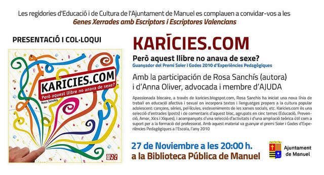 La regidories d’Educació i de Cultura de l’Ajuntament de Manuel es complauen a convidar-vos a la presentació Karícies.com (Edicions 96) i a la Xerrada – Col·loqui posterior amb la seua autora Rosa Sanchís, que tindrà lloc el proper divendres 27 de novembre a les 20:00 h. a la Biblioteca de Manuel. L’acte será presentat per Anna Oliver, advocada i membre d’AJUDA.