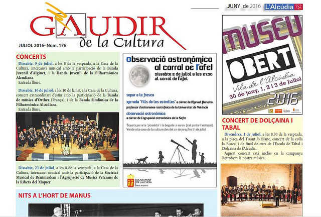 Actes que tindran lloc a l’Alcúdia durant aquest mes de juliol Concerts, observació astronòmica, nits a l’hort de Manus… L’Ajuntament de l’Alcúdia et convida a gaudir de la cutura