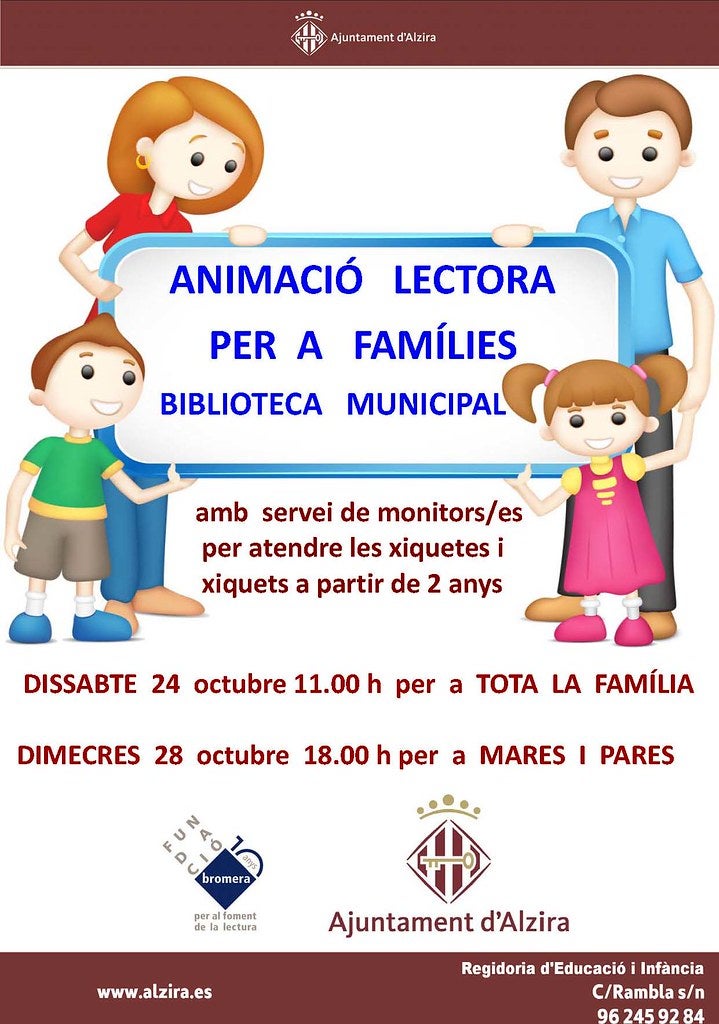 Una de les novetats d’enguany és la realització de la primera sessió d’Animació Lectora que tindrà lloc a les 11 del matí del dissabte 24 d’octubre, en la Biblioteca Municipal. Esta sessió està destinada a mares, pares i fills, encara que hi haurà una segona sessió dimecres 28 d’octubre, a les 18 hores, dedicada a mares i pares.