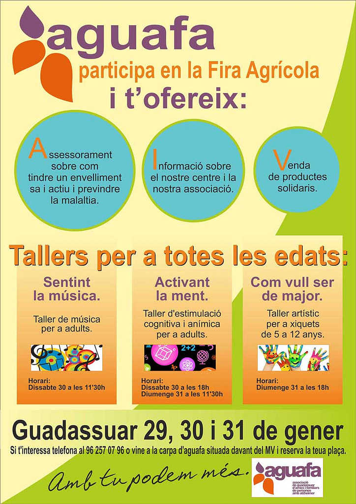 AGUAFA també participarà en la fira. A més d’assessorar sobre com tindre un envelliment sa i actiu i previndre la malaltia, donar informació sobre els seus serveis i la seua associació, vendre productes solidaris, enguany també oferiran tallers per a totes les edats.
