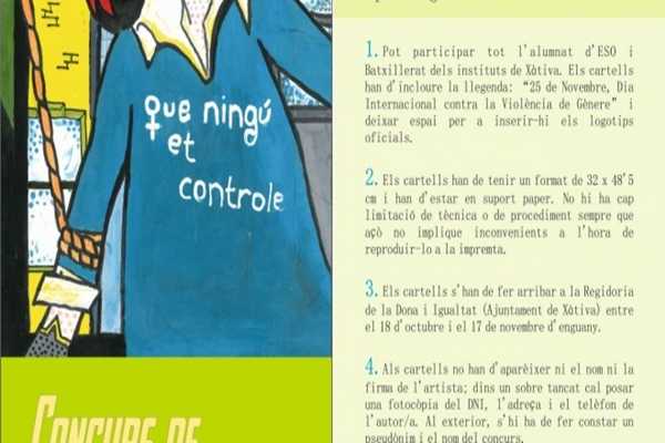 L’Ajuntament de Xàtiva ha convocat distints concursos amb motiu de la pròxima celebració del Dia Internacional contra la Violència de Gènere, que tindrà lloc, com cada any, el proper 25 de novembre. Des de la Regidoria de Dona i Igualtat, s’han convocat els tradicionals concursos de cartells i de dibuix.
