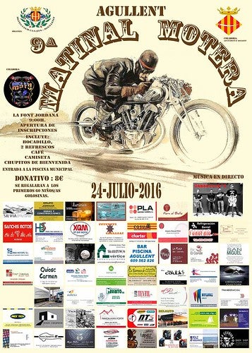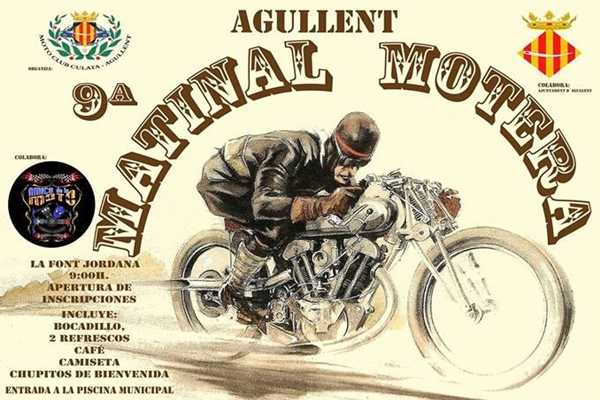 La novena edició de la Matinal Motera d’Agullent, que organitza el Moto Club Culata amb el suport de l’Ajuntament d’Agullent, es celebrarà aquest diumenge 24 de juliol a la Font Jordana d’Agullent. Una matinal que inclou una ruta motera per la localitat, sorteig de regals, música en rock en directe i l’actuació d’Alba Ibánez, campiona del món en la modalitat de salsa l’any 2015.