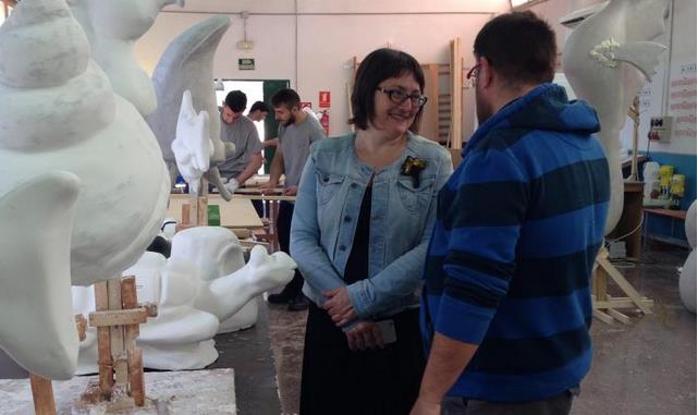 Precisament durant la seua visita, Sonia Tirado ha comprovat l’avanç dels treballs de creació d’aquesta foguera i ha intercanviat impressions amb professors i alumnat del curs, els qui li han explicat els detalls de la seua labor artística i artesanal.