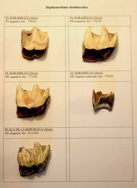Es tracta de deu peces que formen part dels fons del Museu Arqueològic Municipal, i que van ser trobades a diferents espais del terme municipal d’Alcoi. Quatre de les peces corresponen a l’espècie de rinoceront Stephanorhinus hemitoechus, que van ser descobertes a l’àrea del Baradello; una peça dentària de la mateixa espècie de rinoceront, aquesta trobada a la Plaça de la República; i cinc peces de l’espècie de rinoceront Stephanorhinus etruscus, que van ser trobades a la carretera del Molinar.