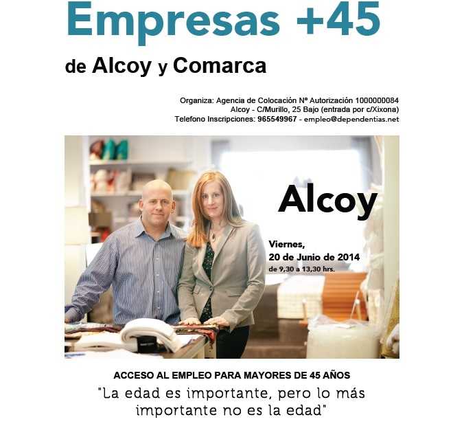 Al fòrum de divendres, que serà inaugurat per l’alcalde d’Alcoi Toni Francés i el director general d’Ocupació i Formació de la Generalitat Rafa Miró, precisament es tractaran aquests aspectes mitjançant una conferència titulada ‘Motivos para ser optimista, a los 45… y sin trabajo’, i a una taula redona anomenada ‘La edad es importante. Pero lo más importante no es la edad’. A la taula redona estaran presents, entre d’altres, responsables de les empreses Germaine de Capuccini, Korott, Aceitunas Serpis o Supermercados Vidal, que són algunes de les empreses preferides pels participants en el programa que volen trobar feina a Alcoi: cada participant ha triat 5 empreses, i aquestes són les més votades. A més, l’acte comptarà amb representants de la Cambra de Comerç, la Unió de Professionals i Treballadors Autònoms, i altres entitats empresarials de les nostres comarques. A més, a la jornada es presentaran els resultats del I Estudio sobre Empleabilidad de Mayores de 45 años en Alcoi y Comarca, un document que permetrà aprofundir en la feina per millorar l’accés d’aquest segment poblacional al mercat laboral.