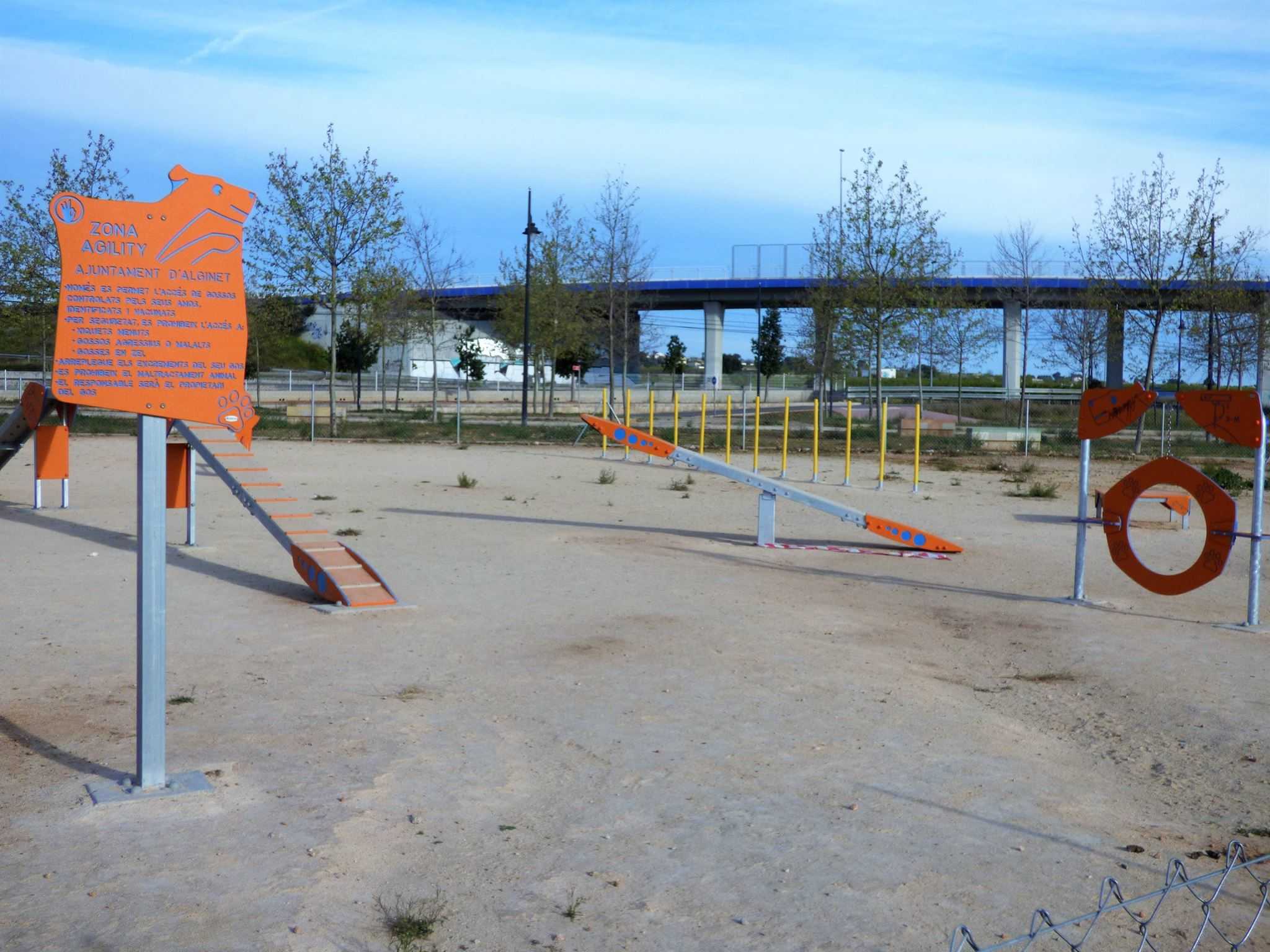 Este parc consta de diferents gronxadors i aparells d’entrenament perquè els gossos puguen divertir-se i fer exercici.