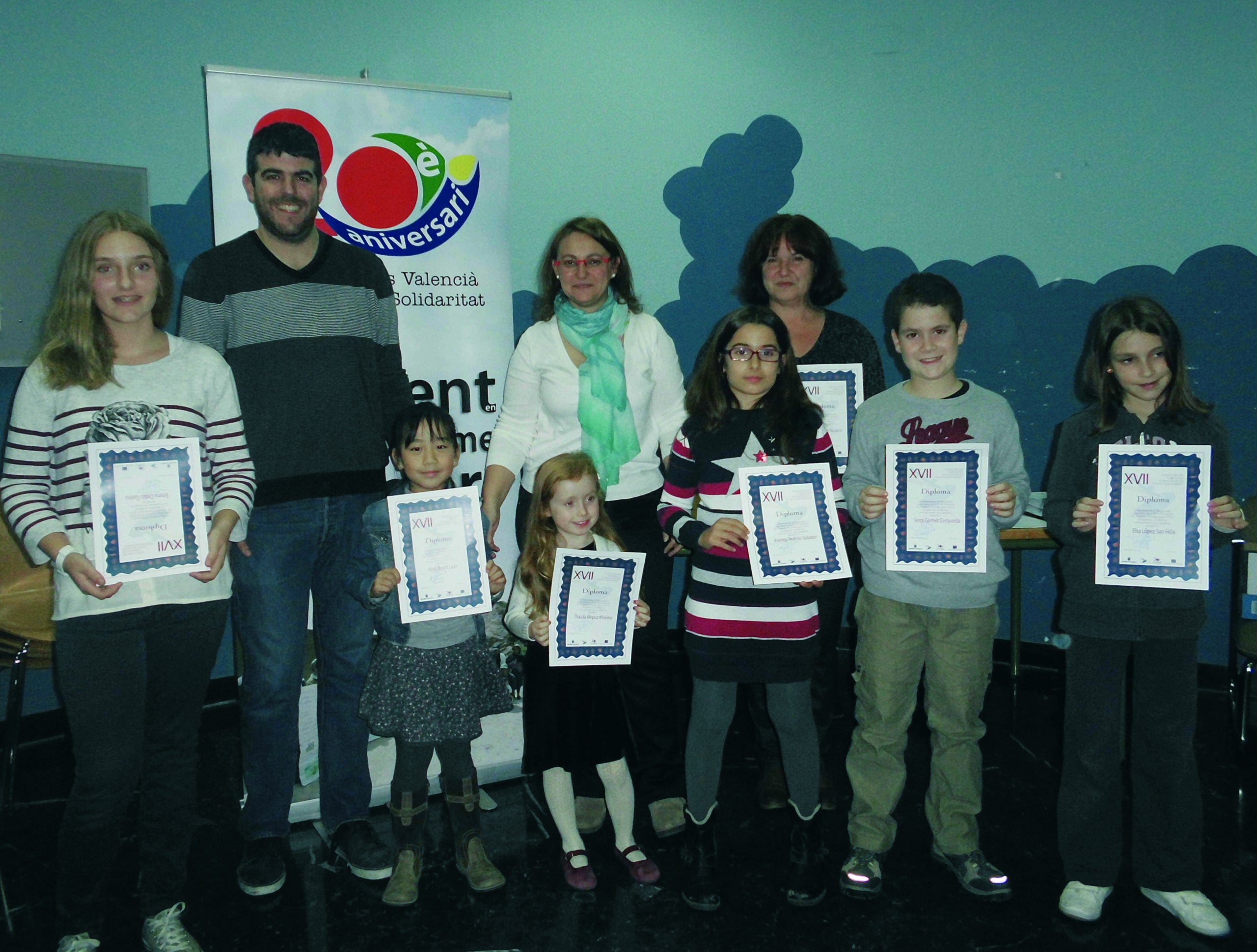 Els xiquets Thaicia Alepuz, Nina Bosch, Elsa López, Sergi Gómez i Andrea Pedrón vencedors en la categoria infantil, junt amb Emma Ordás, reconeguda en la categoria juvenil, i Míriam Bosch, premiada en l’adulta, van arreplegar els diplomes i els lots de material didàctic, acompanyats per les seues famílies.