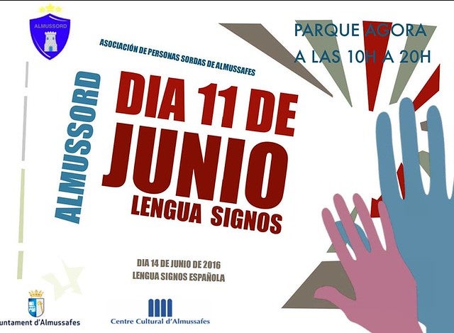 Almussafes, a 8 de juny del 2016. Dissabte que ve dia 11 de juny, entre les 10 i 14 hores, Almussord, l’Associació de Persones Sordes d’Almussafes, invita a la ciutadania a sumar-se a les activitats organitzades amb motiu del 14 de juny, declarat Dia Nacional de les Llengües de Signes Espanyoles. La iniciativa, en la que col·labora l’Ajuntament d’Almussafes i que inclou una diversitat de tallers, se celebrarà en el parc Central.