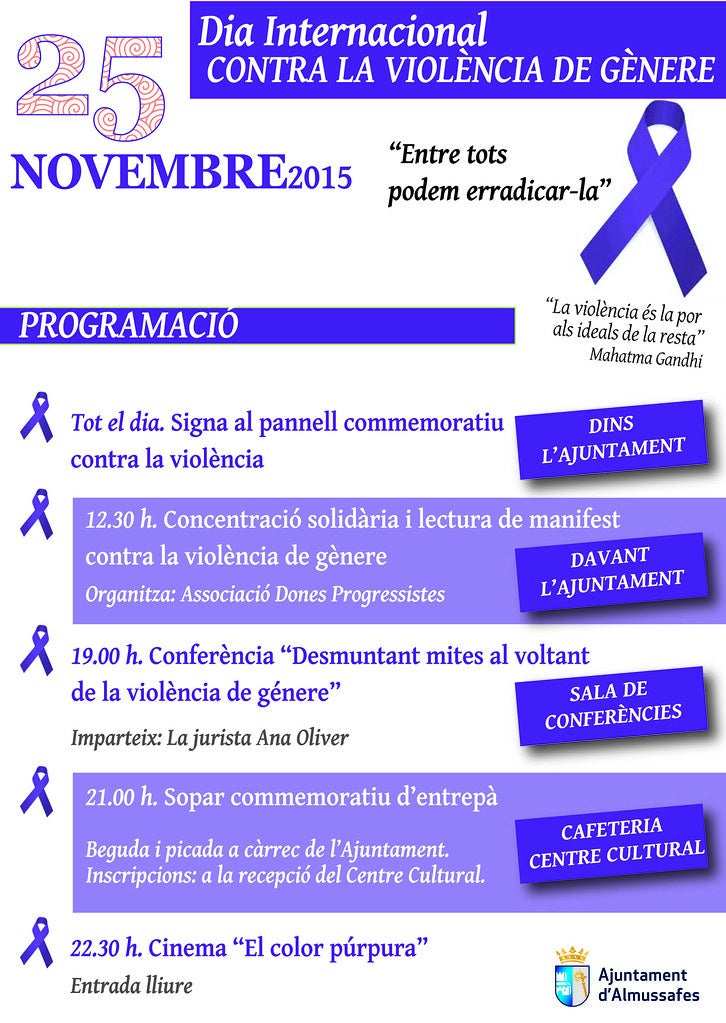 Està prevista la realització d’una concentració solidària amb lectura de manifest, una conferència impartida per una experta en dret, un sopar commemoratiu i la projecció de la pel•lícula “El color púrpura”, que la seua temàtica gira entorn dels drets de la dona.