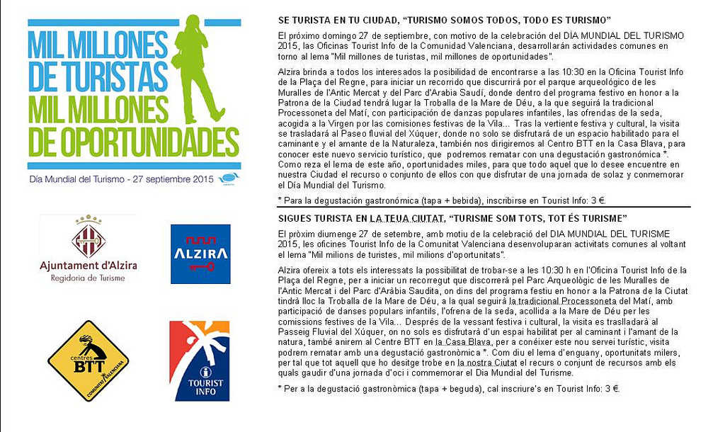 Segons Isabel Aguilar, regidora de Turisme: “Esta es una gran oportunitat per acostar un poc més als nostres veïns i visitants les joies turístiques que oferix Alzira. El nostre objectiu és treballar sempre per a donar a conéixer la història de una ciutat amb uns arrels importants i principalment que la saviesa de la nostra cultura no es perda mai”.