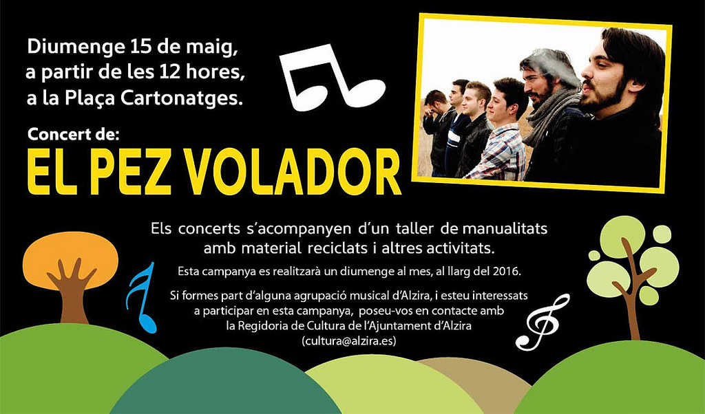 El pròxim diumenge una nova edició de la campanya Somriu als Parcs. Esta vegada comptarem amb el concert del grup EL PEZ VOLADOR a la Plaça de Cartonatges a les 12 hores.