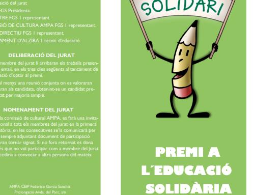 L’AMPA del CEIP Federico García Sanchiz, per mitjà de la seua comissió cultural, en col·laboració amb la regidoria d’Educació de l’Ajuntament d’Alzira, convoca el Premi “Educació Solidària”. Un premi que té l’objectiu de potenciar i donar a conèixer el treball voluntari realitzat per fomentar el desenvolupament educatiu, cultural o personal dins els centres educatius no universitaris.