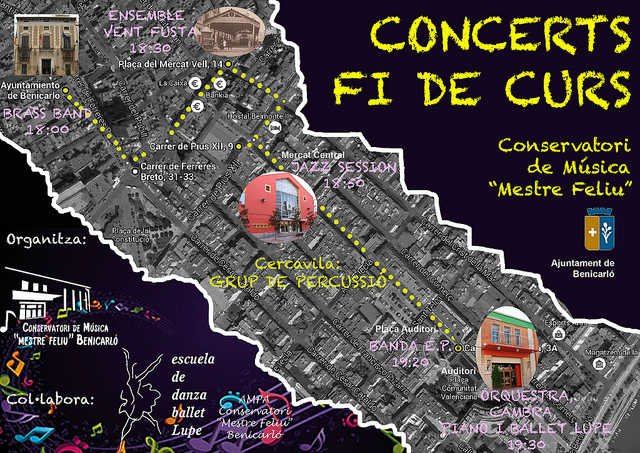 Els alumnes i professors del Conservatori Professional de Música Mestre Feliu celebraran la festa de final de curs realitzant un itinerari musical per alguns dels espais més emblemàtics de Benicarló. La celebració tindrà lloc dimecres 15 de juny i començarà a les 18.00 hores amb l’actuació de la brass band del Conservatori a la plaça de Sant Bartomeu. A les 18.20 hores arrancarà una rua batukada amb el conjunt de percussió fins a la plaça del Mercat Vell. Allà, tindrà lloc l’actuació de l’ensemble de vent-fusta del Conservatori.