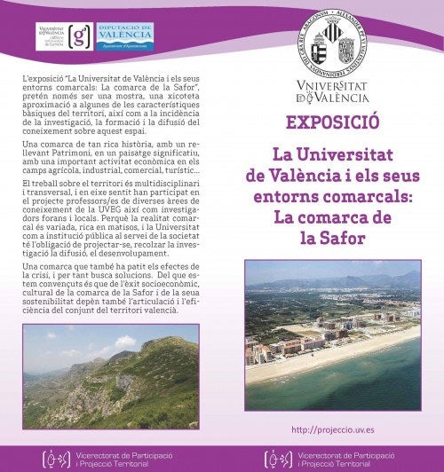 A partir del divendres dia 20 fins al 6 de desembre, a la Sala d’Exposicions de Benifairó estarà instal·lada la mostra organitzada per la Universitat de València-Estudi General La Universitat de València i els seus entorns comarcals: la comarca de la Safor. Després de la seua estada a Gandia, Benifairó és el primer poble on es podrà veure aquesta interessant mostra sobre les característiques bàsiques de la Safor, la qual pretén la difusió i coneixement per part del públic de diversos aspectes de la comarca.