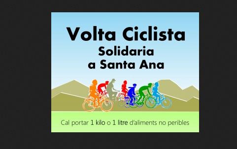 VOLTA CICLISTA SOLIDARIA A SANTA ANA 2016 Inscripcions al gimnàs municipal del 28 de juny fins al 5 de juliol. És obligatòria per obtindre la camiseta Cal portar un quilo o un litre d’aliments no periders.
