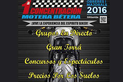 Així mateix, des de les 15:40 h fins a les 03:00 h de la matinada en el Magatzem de Fruïts Bétera no et pots perdre la 1a CONCENTRACIÓ MOTERA organitzada per OBRERES I MAJORALS 2016, patrocinada per QUECAMISETAS.COM, MOTO Y PUNTO i AUTOESCOLA CLAVEL.