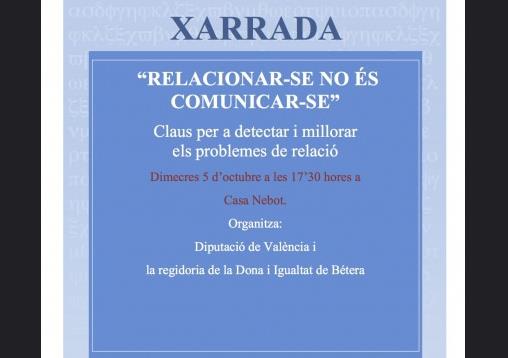 La regidoria de la Dona i Igualtat amb la col·laboració de la Diputació de València ha organitzat una xarrada per al proper dimecres 5 d’octubre amb el títol: “Relacionar-se no és comunicar-se.