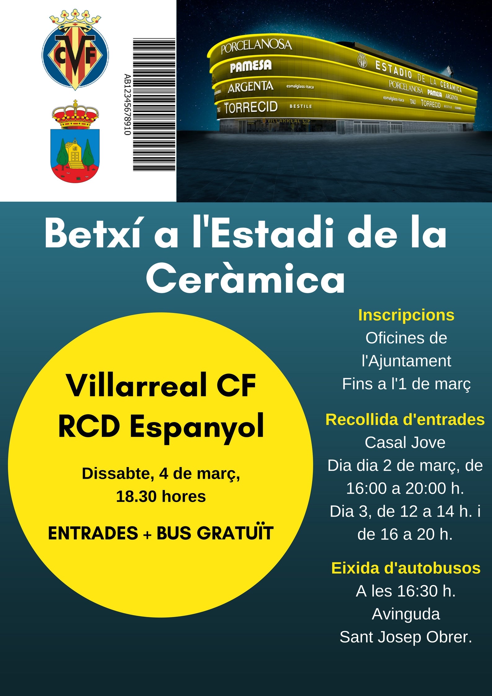 Les persones interessades en assistir al partit poden passar per les oficines de l’Ajuntament, fins al dia 1 de març, en horari de 8:00 a 14:00 h., per tal de realitzar la inscripció.