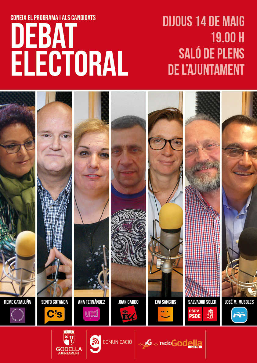 José María Musoles (PP), Salvador Soler (PSPV-PSOE), Eva Sanchis (Bloc-Compromís), Joan Cardo (EU), Ana Fernández (UPyD), Sento Cotanda (Ciutadans) i Reme Catalunya (Canviem entre tots Godella) respondran al qüestionari preparat pel Departament de Comunicació que ha establit uns temps d’intervenció d’entre 1 i 3 minuts per a cada tema, l’ordre del qual es decidirà en el sorteig que es farà 30 minuts abans d’iniciar el programa en el mateix saló de plens.