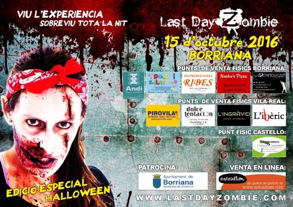 El proper dissabte 15 d’octubre arriba a Borriana un dels esdeveniments d’oci amb major participació amb el Last Zombie Day que tindrà lloc a partir de les onze de la nit en el conjunt de tot el cas urbà de la ciutat. Des de la regidoria de Joventut de l’Ajuntament de Borriana que organitza l’acte lúdic, la seua máxima responsable, Lluïsa Monferrer, ha animat “a tots aquells que estiguen disposats a combinar l’entreteniment amb una dosi de por o d’intriga a inscriure’s en la que serà la primera festa zombie que tindrà lloc a Borriana”. Els organitzadors de la festa que compten amb l’assessorament de l’empresa especialitzada Last Day Ocio Alternativo, han explicat alguns de detalls d’una nit que s’espera moguda a la ciutat. L’inici tindrà lloc a partir de les onze de la nit a la plaça José Iturbi, on l’escena inicial que planteja l’aparició d’un virus a la ciutat servirà com a tret d’eixida del recorregut que tots els equips hauran d’anar completant durant la nit. Així, el trajecte a través d’edificis, places i carrers de la ciutat portarà a cadascun dels equips a anar completant les més de vint proves plantejades pels organitzadors. Depenent del nombre d’inscrits els participants es dividiran en grups per tal de fer coincidir el nombre d’equips amb el de les proves existents, i així que tots i totes estiguen en acció constant completant una darrere de l’altra totes les proves.