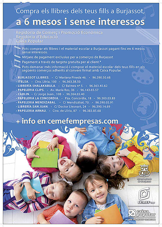 A través de les regidories de Comerç i Promoció Econòmica, dirigida per Emili Altur, i d’Educació, dirigida per Mª Luz Andrés, el consistori firmarà un conveni amb Caixa Popular perquè les famílies puguen adquirir els llibres i el material escolar del pròxim curs acadèmic en els comerços de Burjassot, pagant fins en sis mesos sense interessos a fi que la inversió que han de desembossar no siga tan elevada a l’inici del curs.