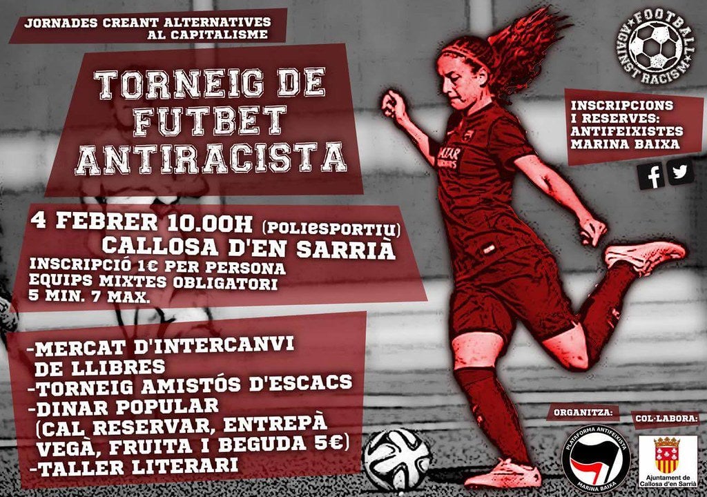 Els interessats a participar en el torneig de futbol, han de tenir en compte que serà obligatori que els equips siguen mixts amb un mínim de 5 i un màxim de 7 jugadors. Les inscripcions tenen un preu d’1 euro per persona i es podran formalitzar a través del Facebook o del Twitter de la Plataforma Antifeixista Marina Baixafins a divendres que ve. Per al menjar popular també serà necessari reservar. El preu és de 5 euros i inclou un entrepà vegà, una fruita i un refresc.