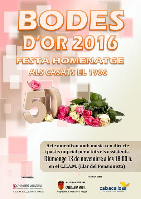 Diumenge que ve, 13 de novembre, les parelles casades el 1966 tenen una cita en les instal·lacions del CEAM de Callosa d’en Sarrià, ja que se celebrarà una festa per a commemorar les seues bodes d’or. La iniciativa està organitzada per la Generalitat Valenciana amb la col·laboració de la regidoria d’Atenció al Major de l’Ajuntament de Callosa.