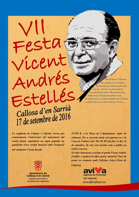 Les regidories de Cultura i Normalització Lingüística han organitzat un sopar popular i un recital musical per a homenatjar el poeta valencià Vicent Andrés Estellés, amb motiu de l’aniversari del seu naixement. Les persones que ho desitgen podran recitar poemes d’Estellés o de qualsevol altre poeta valencià. Per a açò hauran de posar-se en contacte amb Aviva en la Casa de Cultura. La trobada comptarà a més amb l’actuació del cantautor valencià Vicent Savall.