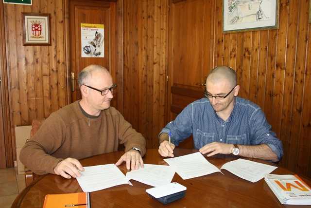 L’alcalde de Callosa d’en Sarrià, Josep Saval, ha signat aquest matí en l’Ajuntament un conveni de col·laboració amb el grup de dolçaina i tabal ‘Colla El Pinyol’, representat per Iván Gregori Ferrando.