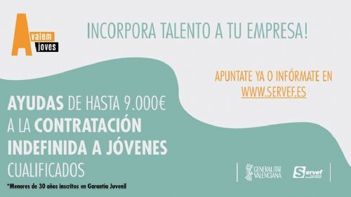La Conselleria d’Economia Sostenible, Sectors Productius, Comerç i Treball, va publicar l’Orde per la qual s’establixen les bases reguladores del programa de foment d’ocupació per a la contractació de persones jóvens qualificades (AVALEM JOVES), en el marc del Sistema Nacional de Garantia Juvenil, l’objectiu del qual és la concessió de subvencions per a fomentar la contractació indefinida inicial de les persones jóvens qualificades, que figuren inscrites en el fitxer del Sistema Nacional de Garantia Juvenil en l’àmbit territorial de la Comunitat Valenciana. Podrà ser beneficiari d’estes ajudes qualsevol ocupador de naturalesa jurídica privada, inclosos els treballadors autònoms, amb àmbit d’actuació a la Comunitat Valenciana.