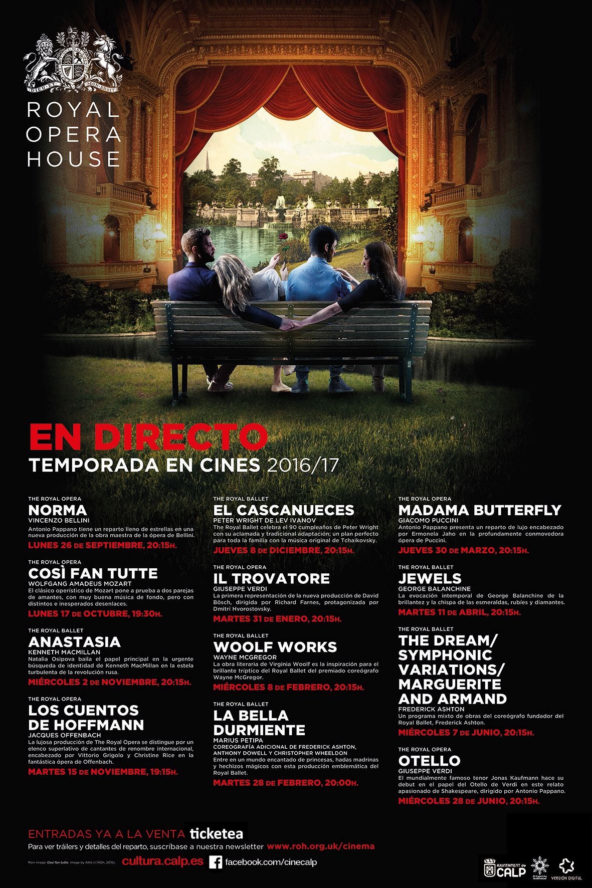 Les representacions de la Royal Opera House poden veure’s en més de 2000 sales de cine de més de 60 països. Este projecte ha fet possible que el públic de tot el món gaudisca de les representacions del Convent Garden des del seu cine més pròxim. A més cada una de les emissions està presentada per personalitats respectades de la Royal Opera House, i compta amb entrevistes exclusives i imatges de la producció.