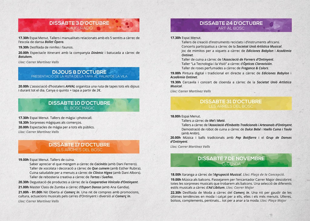 Dissabte 10 d’octubre majors i menuts delectaran la vista amb sorpreses i espectacles en una jornada ambientada en la màgia; el 17 d’octubre “els aromes del bosc” portaran tallers de cuina, degustació de productes locals, master class de zumba i obertura nocturna d’establiments amb la “Nit Oberta”. El 24 d’octubre baix el lema “Art al bosc” hi haurà de nou tallers de creació d’instruments, roses perfumades, tecnologia de la visió, concerts, jocs, pintura digital i tradicional en directe i una cercavila.