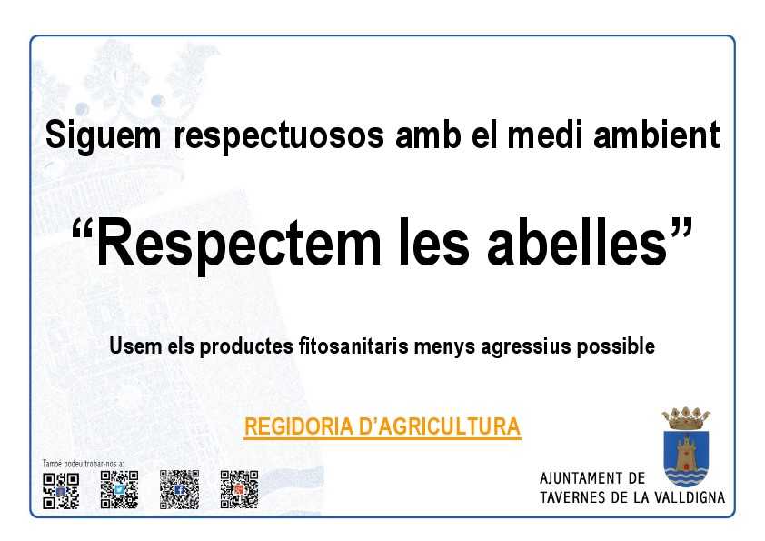L’Ajuntament de Tavernes, a través de la Regidoria d’Agricultura, ha iniciat la campanya “Respectem les abelles” per tal de conscienciar en el respecte el medi ambient i la fauna útil.