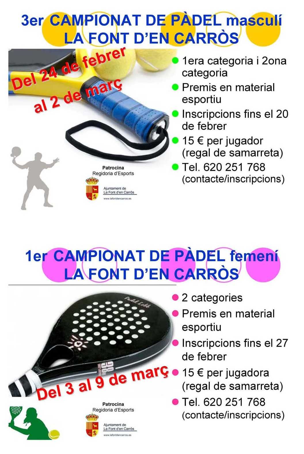 La Regidoria d’Esports de l’Ajuntament de la Font d’en Carròs organitza el 3er Campionat de Pàdel Masculí i el 1er Campionat de Pàdel Femení. El 3er Campionat de Pàdel Masculí es disputarà del 24 de febrer al 2 de març mentre que el 1er Campionat de Pàdel Femení es disputarà del 3 de març al 9 de març.